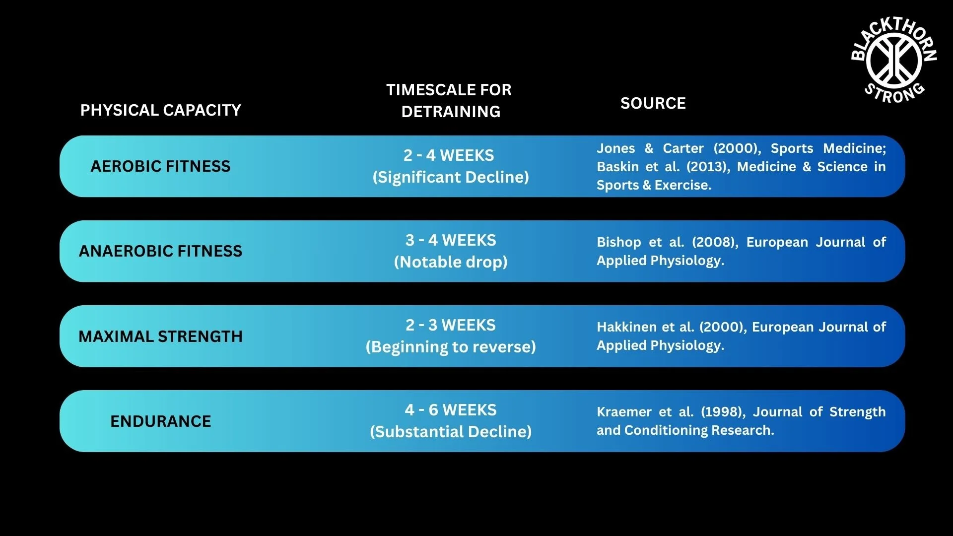 To give you an idea of how quickly various components of fitness can be lost, here’s a table summarizing research-backed detraining timescales: